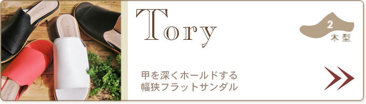 幅狭フラットサンダルTory(トリー)はBobbiやNicole、Alex、Parkerなどと同じ「木型2」の靴です。